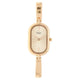 This sleek watch by Titan Raga is analog in nature and features a contemporary shaped dial with curved edges. The dial is rose gold in colour and it marks the time with two applique baton indices placed at 30-minute intervals and three plain hands. Stripes on the dial radiating from the centre serve as indices as well. The watch secures with a rose gold-toned bracelet-style stainless steel strap with a jewellery clasp.